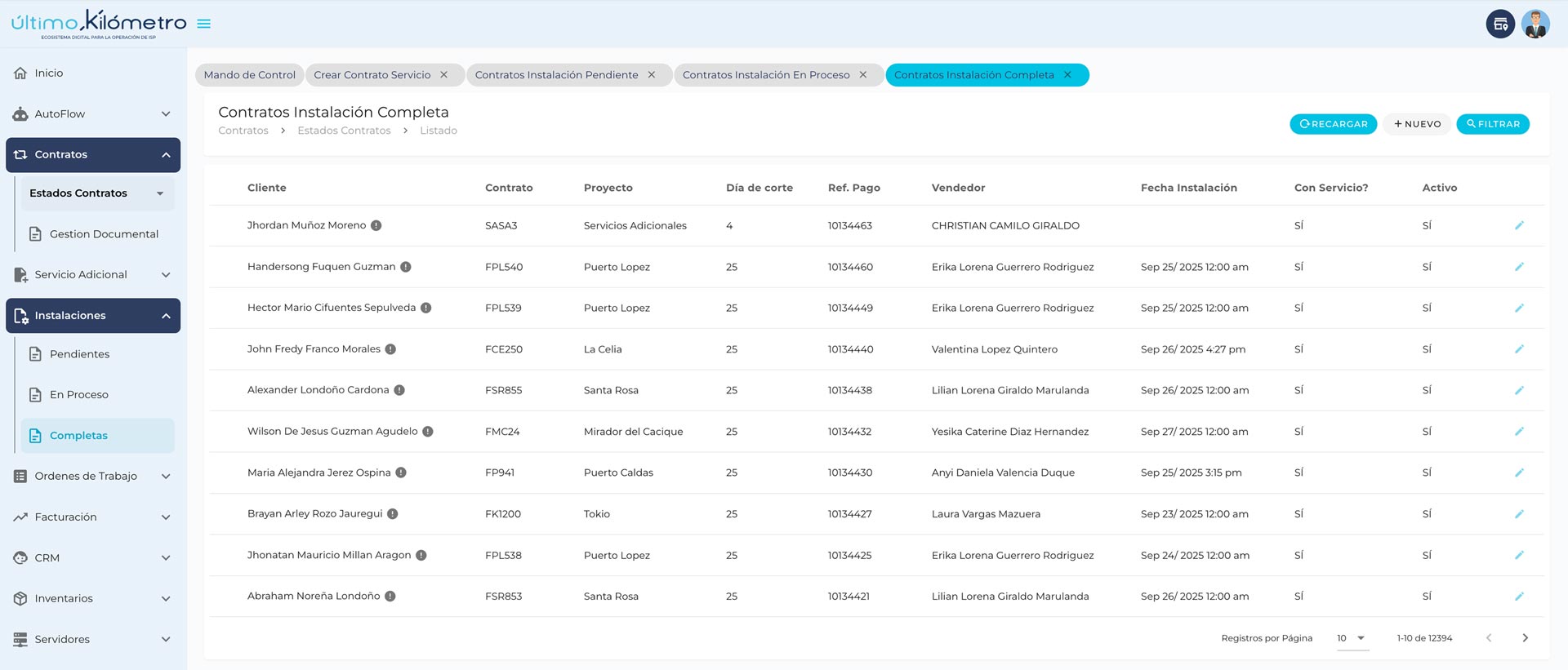 Aquí se almacenan todas las instalaciones finalizadas correctamente. Permite consultar el historial por cliente, validar que se completó todo el proceso técnico y tener trazabilidad del cierre del acta de instalación.