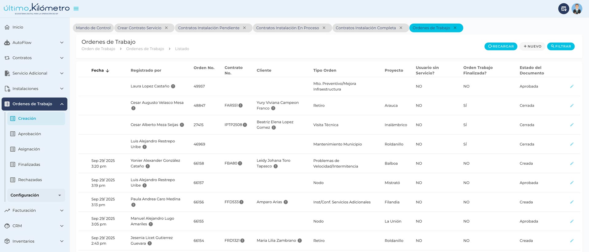 Revise y valide las órdenes de trabajo creadas antes de su ejecución. Esta etapa permite verificar la información diligenciada, confirmar observaciones y decidir si la orden se aprueba o se rechaza. De esta forma se asegura que solo los procesos correctos y completos avancen en el flujo operativo, garantizando control y cumplimiento de estándares internos.