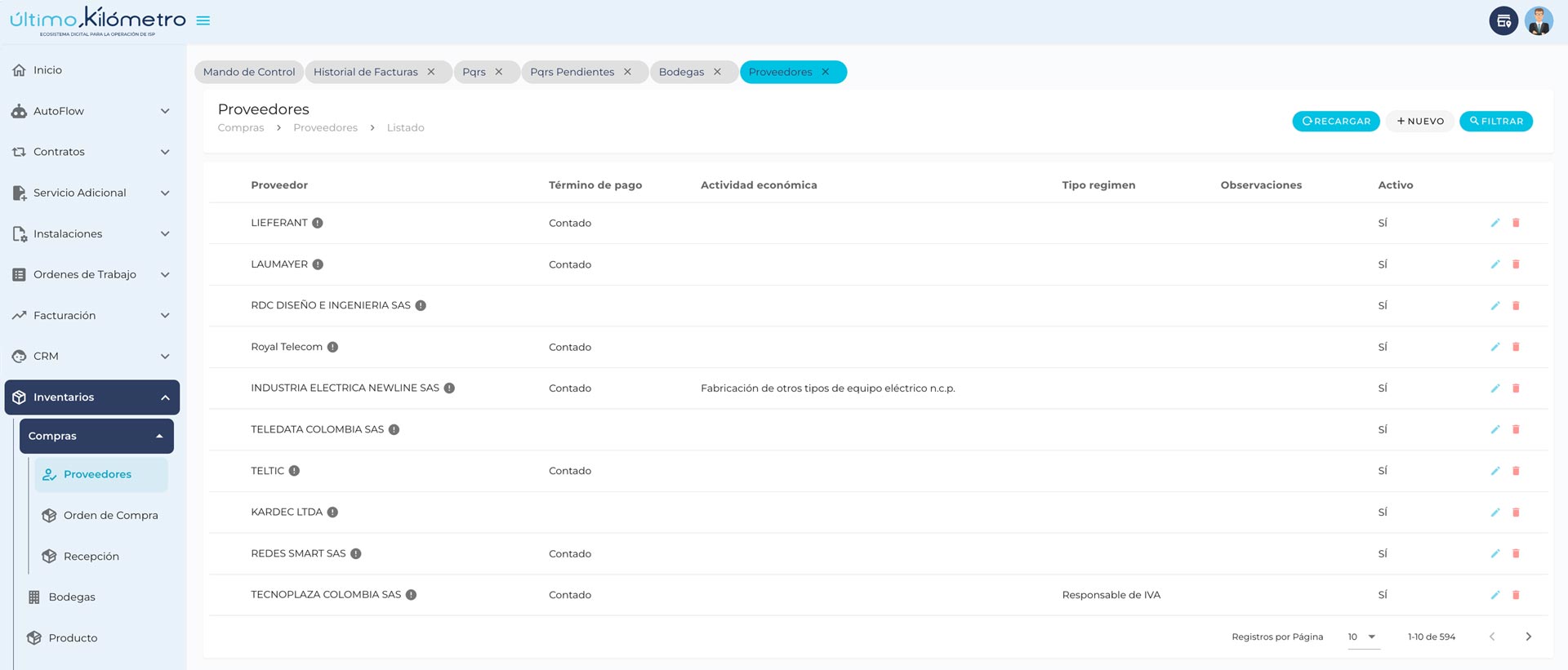 Centralice la información de sus aliados comerciales registrando datos de identificación, régimen tributario, actividad económica, términos de pago y ubicaciones. Esta etapa garantiza un control claro y confiable sobre los proveedores, facilitando la trazabilidad de compras, negociaciones y condiciones pactadas.
