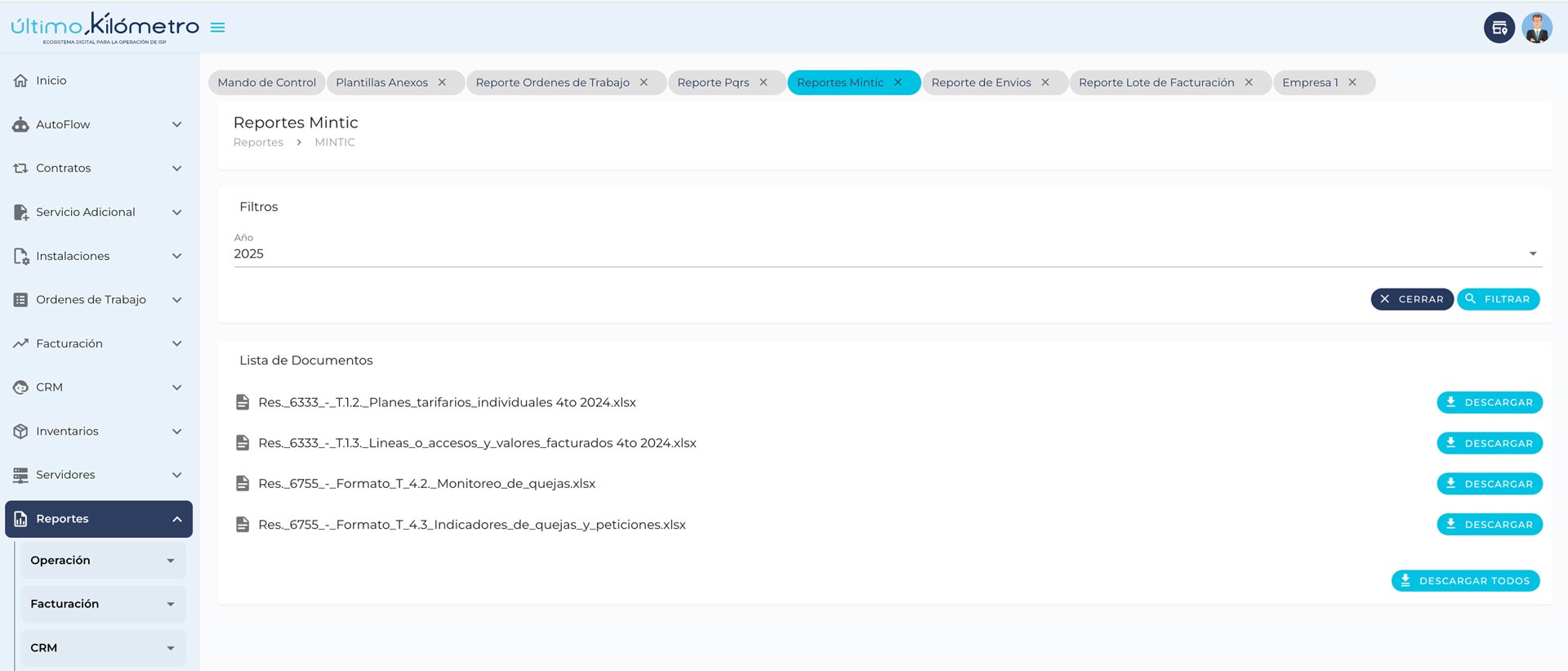 Sí. ERP UK genera reportes automatizados para el MinTIC, integra facturación electrónica con la DIAN y permite trazabilidad completa de los procesos administrativos y técnicos.