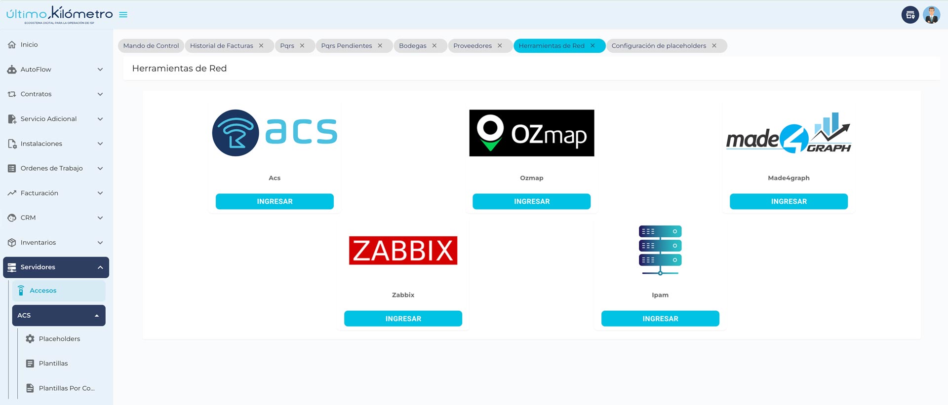 Gestione de manera centralizada los accesos a las principales herramientas de red utilizadas por su ISP. Desde este módulo, los equipos técnicos pueden ingresar directamente a plataformas como ACS, OZmap, Made4Graph, Zabbix e IPAM, sin necesidad de múltiples usuarios o rutas de ingreso. Esto asegura control, orden y trazabilidad en cada interacción con los sistemas externos.